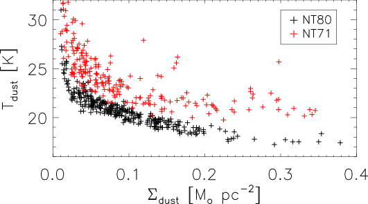 Figure 4: Correlation between dust surface density and temperature for NT80 (black) and NT71 (red). |