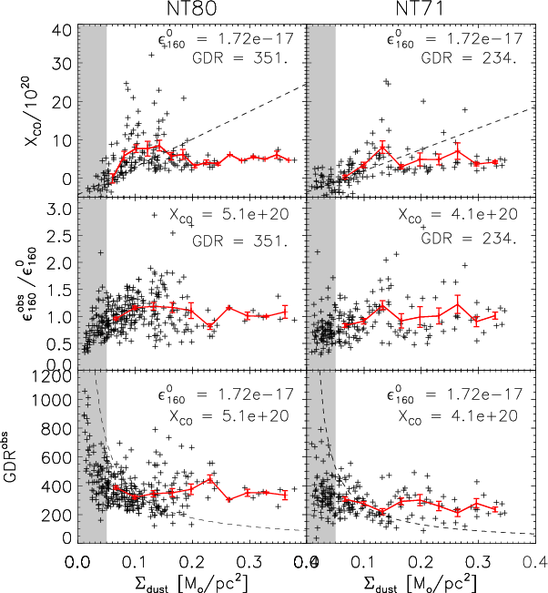 emissivity or gas-to-dust ratio with dust surface density, the X factor is enhanced at