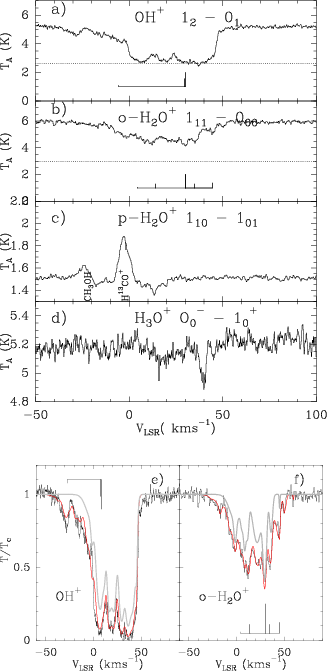 Previous attempts to observe interstellar H2O+ and OH+ from optical spectroscopy are very limited. Smith et al. (1984) report an upper limit of 1012 cm-2 for H2O+ based on optical absorption spectroscopy. No observation of the OH+ transition at 358.4 nm has been reported until very recently (Krelowski et al., private communication). Submillimeter telescopes have been more successful in detecting these ions. With the Atacama Pathfinder EXperiment (APEX) telescope Wyrowski et al. (2010) detected two hyperfine-structure components of the OH+ N=1-0 J=0-1 transition near 909.2 GHz towards the strong continuum source Sgr B2(M) and concluded that OH+ plays a major role in the chemistry of the diffuse molecular gas. Using HIFI on Herschel, Ossenkopf et al. (2010) report the detection of o-H2O+ absorption in the three massive star-forming regions NGC 6334, Sgr B2, and DR 21.