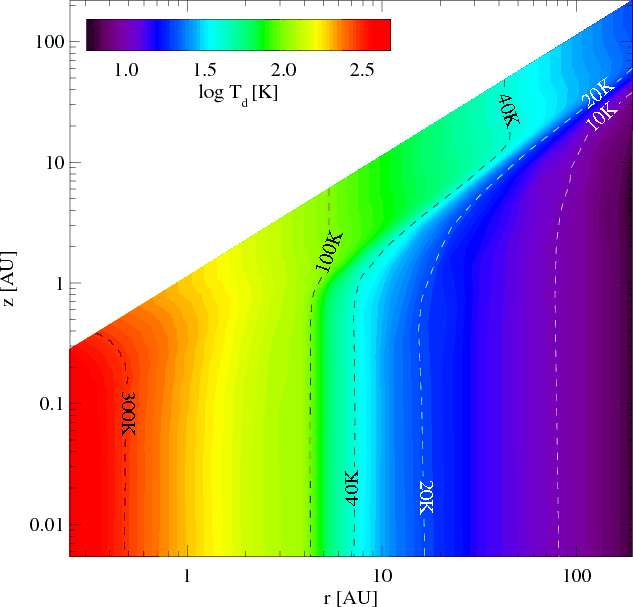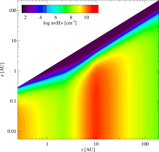 We show in Figs. A.1, A.2, and A.3 the density, dust temeprature, and gas temperature profile respectively for a disk model with