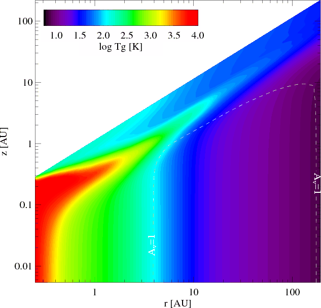 Figure A.3: Gas temperature profile. The contour of AV = 1 is shown in white. |