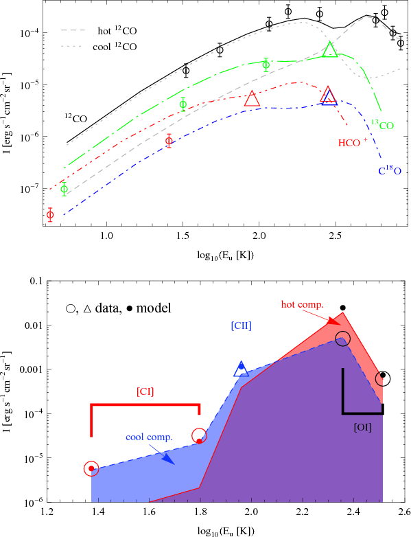 Figure 4: Two-ensemble PDR model fit to the observed CO, HCO+, and fine structure line intensities, shown as function of the upper level energy. HIFI measurements are depicted as open triangles, complementary data points as open circles. The dotted line and the shaded areas indicate the contributions from the two ensembles to the CO and the fine structure lines, respectively. |
