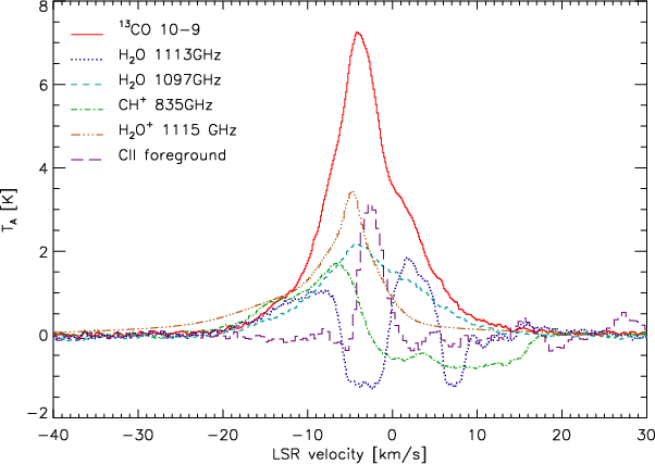 AcknowledgementsHIFI has been designed and built by a consortium of institutes and university departments from across Europe, Canada and the United States under the leadership of SRON Netherlands Institute for Space Research, Groningen, The Netherlands and with major contributions from Germany, France and the US. Consortium members are: Canada: CSA, U.Waterloo; France: CESR, LAB, LERMA, IRAM; Germany: KOSMA, MPIfR, MPS; Ireland: NUI Maynooth; Italy: ASI, IFSI-INAF, Osservatorio Astrofisico di Arcetri- INAF; Netherlands: SRON, TUD; Poland: CAMK, CBK; Spain: Observatorio Astronmico Nacional (IGN), Centro de Astrobiología (CSIC-INTA). Sweden: Chalmers University of Technology - MC2, RSS & GARD; Onsala Space Observatory; Swedish National Space Board, Stockholm University - Stockholm Observatory; Switzerland: ETH Zurich, FHNW; USA: Caltech, JPL, NHSC.This work was supported by the German Deutsche Forschungsgemeinschaft, DFG project number Os 177/1-1. A portion of this research was performed at the Jet Propulsion Laboratory, California Institute of Technology, under contract with the National Aeronautics and Space Administration.