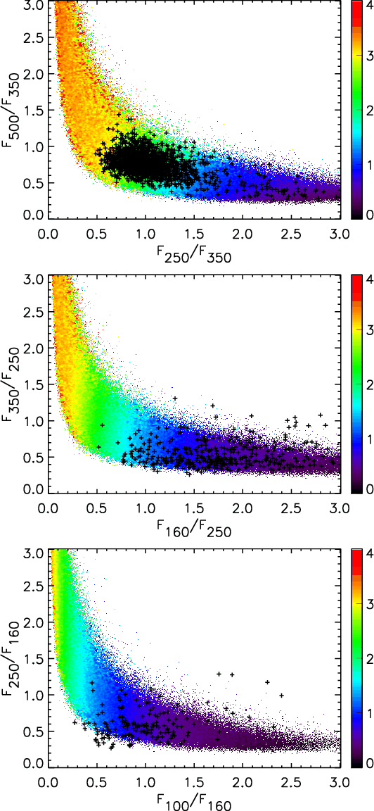 at shorter wavelengths,while bright sources seen in longer SPIRE bands are likely to be on average at high redshifts.