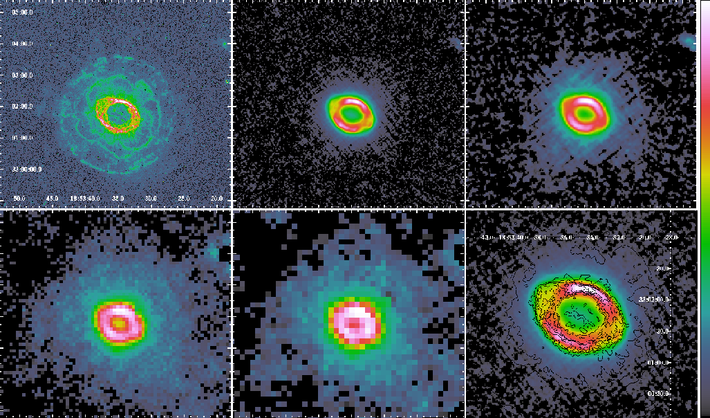 NGC 6720 in five photometric bands. Top row from left to right: H2 2.12 |