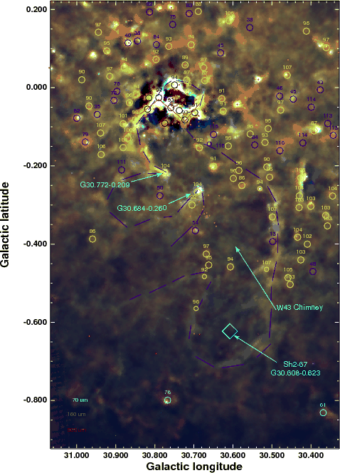 There are at least two locations in the ``W43 Chimney'' containing OB stars or associations; W43 and G30.684-0.260. Fich et al. (1990) have shown that G30.608-0.623 is likely to be associated with the foreground H II region Sh2-67. However, many molecular clouds associated with the dust rim surrounding this region have velocities similar to W43. Thus, these clouds are likely to be associated with the W43 chimney. Based on the dim 20 cm continuum, the large sizes of cometary clouds facing G30.684-0.260, and their location up to 20 pc away, the massive stars in this region (marked in part by the lower cluster of compact 6 cm sources in Figs. 1 and 3) must to be older than W43. Ionization fronts up to 40 pc away along the l = 30.5 wall appear to be illuminated from this direction (Fig. 1). Assuming a typical propagations speed of 5 km s-1 for a typical D-type I-front moving through the ISM, the age of this cluster is likely to be 5 to 10 Myrs. We hypothesize that as the expanding H II region powered by this group impacted denser gas toward the Galactic plane, it triggered the formation and gravitational collapse of the GMC that evolved into W43, giving birth to its oldest massive stars (the O and WR cluster). Subsequently UV radiation from the central O+WR cluster compressed the parent cloud towards both low- and high Galactic longitudes, triggering the formation of additional massive stars.The bipolar morphology of the W43 H II region indicates that its evolution has been constrained by dense gas associated with the warm 70