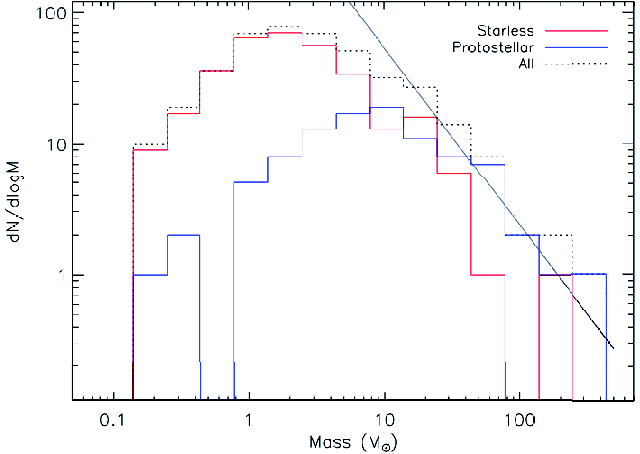 with the -1.35 slope of the Salpeter IMF (e.g., in Aquila; see André et al. 2010). For comparison with the RMC, a Salpeter slope is also shown