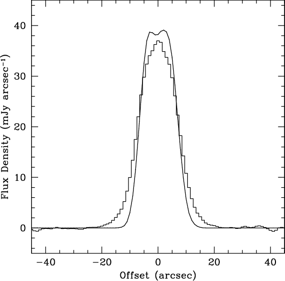 In Fig. 3, one-dimensional cuts along the major axis of the observed and de-convolved 100