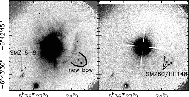 shape of the cavity. They reveal a previously unknown, faint H2 bow shock enveloping the SMZ 60/HH 148 compact knots (Stanke et al. 2002; Corcoran & Ray 1995), constituting the clearest evidence so far for a collimated flow running northeast to southwest through the cavity. This flow, which likely originates in the V 380 Ori multiple system, could possibly excavate the southern part of the cavity. NGC 1999 in the southeastern corner of the PANIC image resembles a small bow shock in a flow coming from the northwest; together with NGC 1999, located northwest of V 380 Ori (Fig. 1), it indicates a second, northwest to southeast oriented flow, which could be responsible for digging the northwestern lobe of the cavity.