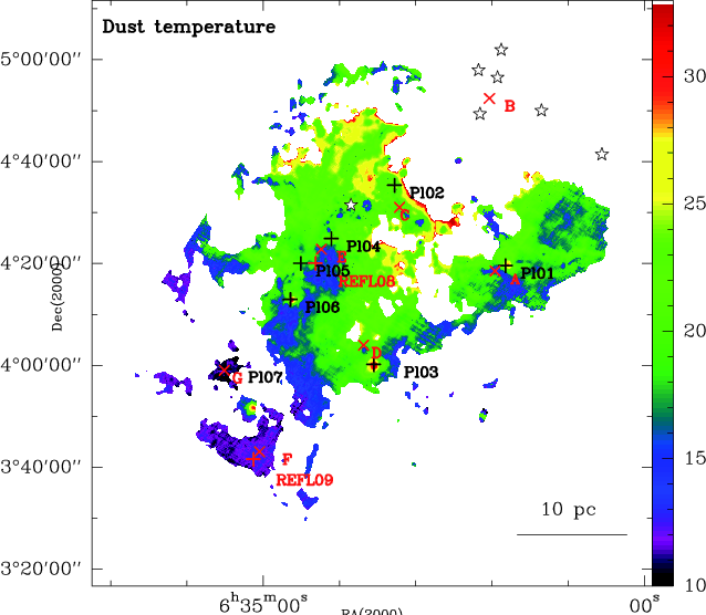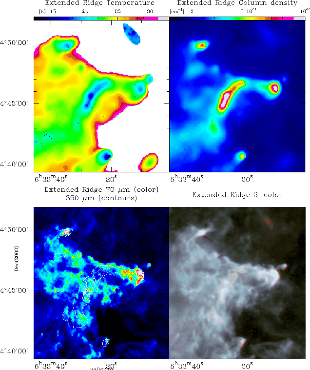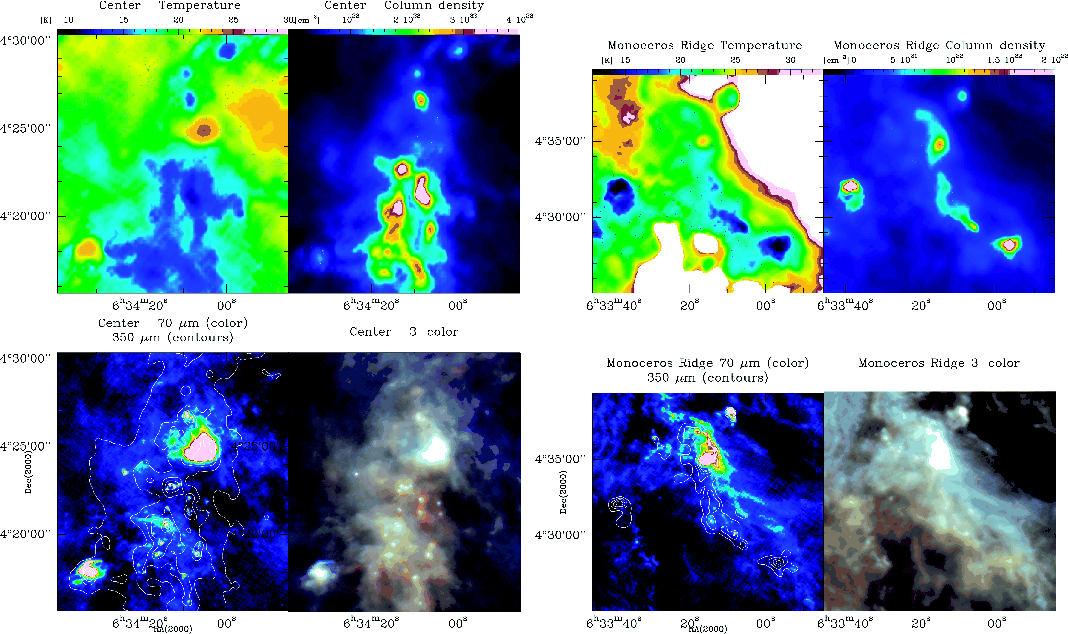 In Fig. 5 in Motte et al. (2010) the spatial distribution of the most massive dense cores is shown and in our Table 1 the statistics of these sources with regard to the different regions is summarized. We adopt the classification for prestellar cores to evolved YSO defined in Motte et al. (2010) and compute the relative numbers of young vs. evolved sources in each region (last column in Table 1). The resulting sequence may indicate that there is an age-gradient across the RMC with the PL7 cluster being the youngest, in the remote part of the cloud, and the Monoceros Ridge and Shell Region, close to the H II-region, being the most evolved. An independent confirmation of the youth of cluster PL7 is given in Hennemann et al. (2010) in their protostellar envelope mass vs. bolometric luminosity diagram. Note that Roman-Zuniga et al. (2008) also detected an increasing fraction of young stars with increasing distance to the NGC 2244 cluster center and Balog et al. (2007) found that the Class II sources are concentrated at the center of NGC 2244, while the Class I sources are located further away from the cluster. On the other hand, cluster PL3 does not fit this scenario well, because it seems to be a more evolved region, but is located in the more remote part of the cloud. A tentative explanation may be that because it is more exposed to UV radiation and thus less shielded by denser gas, (like the Center and remote region) its evolution might have been accelerated by the radiative impact. However, we emphasize that there are not enough sources analyzed so far to draw a firm conclusion. A more detailed analysis with a larger sample and significant statistics is required, which is planned for the future.