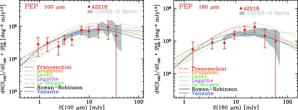 Table 2: Resolved CIB surface brightness for Abell 2218, and combined with the COSMOS contribution in the higher flux range (``PEP'').