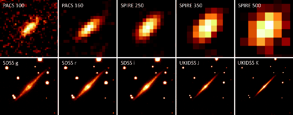 Figure 3 shows the spectral energy distribution (SED) of UGC 4754 at optical/NIR (top panel) and FIR/submm (bottom panel) wavelengths. The solid black line in the top panel corresponds to the attenuated SED of the SKIRT model fitted to the SDSS and UKIDSS images, and the magenta line is the unattenuated SED. Our radiative transfer model reproduces the optical/NIR SED very well. In the bottom panel, the solid black line corresponds to the FIR emission of the model assuming LTE for all grains, and the dotted line represents the contribution of only the large grains. Our model significantly underestimates the observed IRAS and Herschel fluxes. This behaviour, a dust energy-balance problem, has been noted for other spiral galaxies where the FIR emission calculated from radiative transfer modelling is compared to the observed IRAS, ISO, and/or SCUBA fluxes (e.g. Popescu et al. 2000; Bianchi et al. 2000; Misiriotis et al. 2001).
