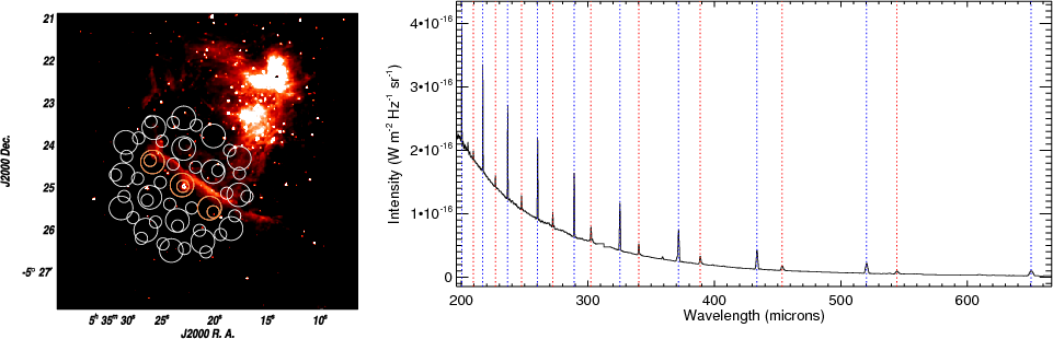 Left: map of the Orion Bar obtained with Spitzer (IRAC at 3.8 |