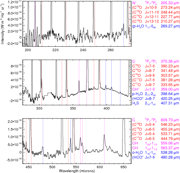 structure lines of C and N+, and emission lines from radicals and molecules such as CH+, CH, H2O or H2S.
