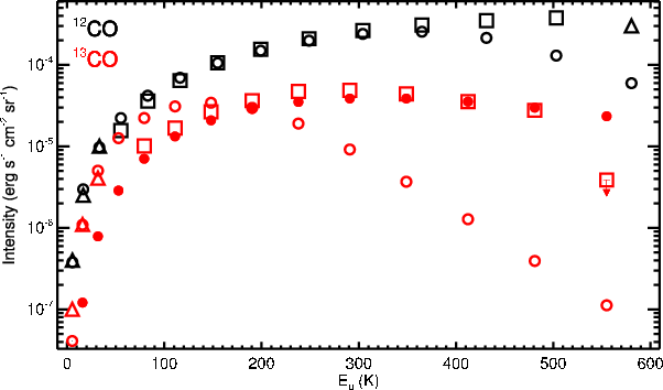 upper limits. The empty circles show the RADEX calculation for T = 85 K, n=105 cm-3, N(12CO) = 1019 cm-2 and N(
