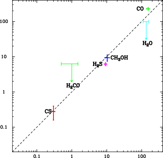 Figure 6: Comparison of measured abundances relative to HCN in comets C/2006 W3 (Christensen) and C/1995 O1 (Hale-Bopp) at 3.3 AU from the Sun. |