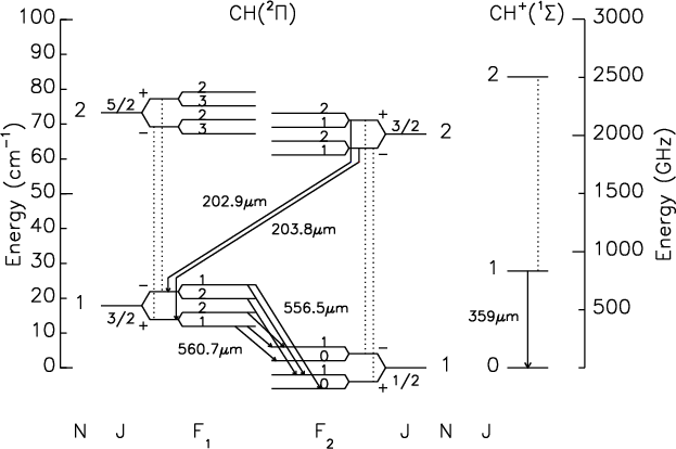 (1-0) in absorption against a galactic source. CH N=2-1 transitions have been detected by Stacey et al. (1987) and Polehampton et al. (2005) toward SgrB2 and by Liu et al. (1997) in NGC7027.