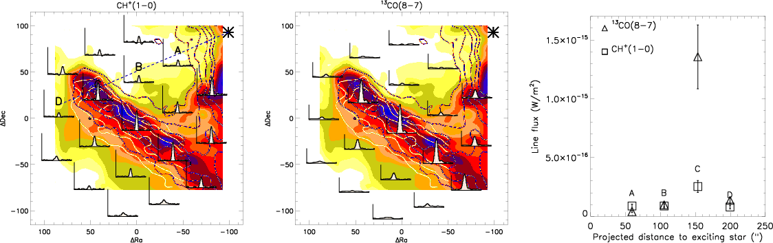 The fact that the CH+ ion is seen extended all around the bar in the lower AV regions and in high abundance seems to support the importance of excited H2 in the CH+ formation route.