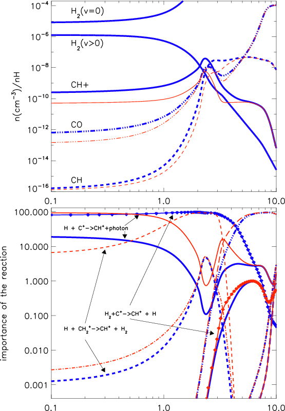 The relative importance of the CH+ production reactions, for both models, is shown in the lower panel of Fig. 3.