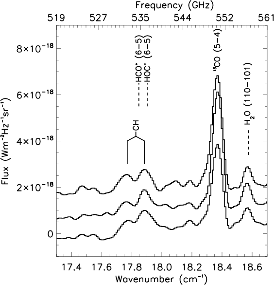 At lower frequencies, a pair of lines is observed at the position of the lambda-doublet CH transitions as shown in Fig. 4. In estimating the abundance of CH and CH+