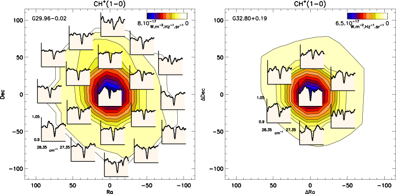 G29.96-0.02 and G32.80+0.19 are two ultra compact HII regions (e.g. Wood & Churchwell 1989), located near the Galactic plane. A global analysis of G29.96-0.02 SPIRE/FTS data can be found in this issue (Kirk et al. 2010). Both HII regions display a CH+ absorption line at a few percent of the continuum level. From a study of the line-to-continuum ratio maps shown in Fig. 5, it appears that for each continuum level across the maps, the amount of absorption remains essentially the same, within the signal-to-noise limits for the outer pixels. This suggests that the methylidyne ion is, as expected from its electronic visible absorption transitions, present in the foreground diffuse interstellar medium in relative high abundances. The apodized resolution of the spectra is 0.0724 cm-1, corresponding to about 780 km s-1for the considered CH+ transition. Although the absorptions appear shallow, at the SPIRE/FTS resolution, a 5% absorption corresponds to a saturated line about 38 km s-1 wide. This is consistent with the velocity dispersion of the foreground ISM as seen in HI absorption (e.g. Fish et al. 2003, Fig. 1). This precludes us from deriving stringent column densities at this level of analysis.