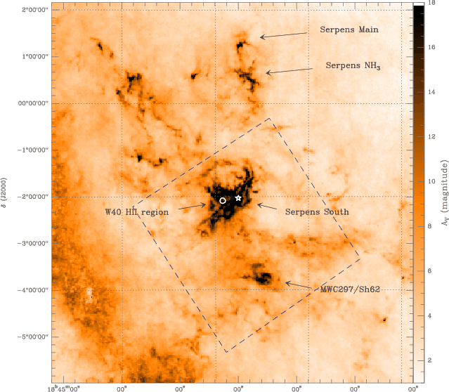 three star-forming sites in Aquila, with W40/Sh2-64 H II region by far