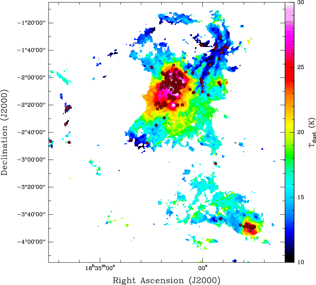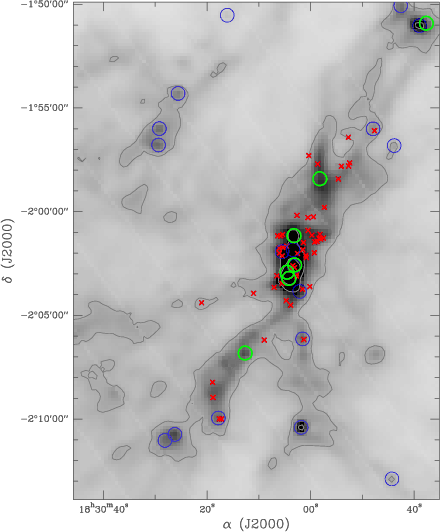 A synthesized view of these first results based on this novel panchromatic analysis of infrared to millimeter range data for this area is given in Fig. 5. It shows the distribution of Herschel protostars compared to the Spitzer sources. The first analysis of this field indicates that even in a highly clustered region like Serpens South, a significant population of protostars were found to be missing by pure near and mid-infrared imaging with as many as 7 newly detected Class 0 objects in this field. We also note that the Spitzer protostars (most of these not detected with Herschel) probably correspond to evolved or low-luminosity Class I objects.