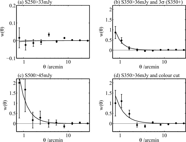 Submillimetre (sub-mm) selected galaxy samples provide a unique way to trace obscured star formation out to high redshifts (Blain et al. 2002). Models for the evolution of such populations disagree on the nature of the sub-mm sources at high redshifts, with some claiming that they are massive galaxies in the process of forming most of their stellar mass (Granato et al. 2004; Narayanan et al. 2010; Davé et al. 2010) while others model them as lower mass sources undergoing bursts of star formation with a top heavy IMF (Baugh et al. 2005; Lacey et al. 2010). While evidence on individual sources largely supports a massive halo scenario (Dunne et al. 2003; Swinbank et al. 2008; Michalowski et al. 2010), the best way to measure the statistical halo properties of this population is to measure their clustering. The three-dimensional clustering of sub-mm galaxies provides information about the dark-matter halos that they populate, but direct measurements need distance estimates for each galaxy, which we do not have for our sample. The angular clustering can be measured for flux-limited samples but, in order to compare with models, predictions are required for both the n(z) of flux limited samples and the intrinsic 3-d clustering of the galaxies. The sub-mm colours depend on the source redshift, and so selecting on colour can preferentially select high or low redshift samples (see e.g. Amblard et al. 2010).