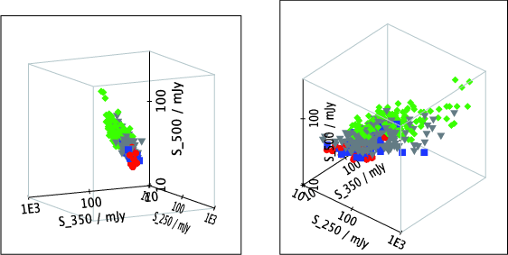 we plot the 3-dimensional SPIRE flux-flux-flux parameter space for our