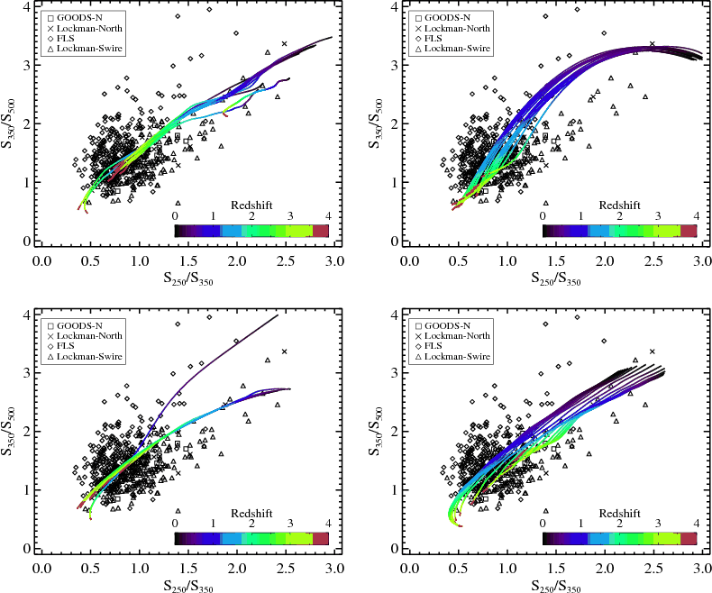 Figure 3: S350/S500 - S250/S350 colour-colour plots for the SPIRE sources. Over plotted are the colour tracks from the galaxy evolution models of top-left Pearson et al. (2007), top-right Xu et al. (2001), bottom-left Lagache et al. (2003), and bottom-right Dale & Helou (2002). The redshift in the tracks is colour coded and runs from 0 to 4. The black symbols represent all unblended SPIRE sources according to the legend. |