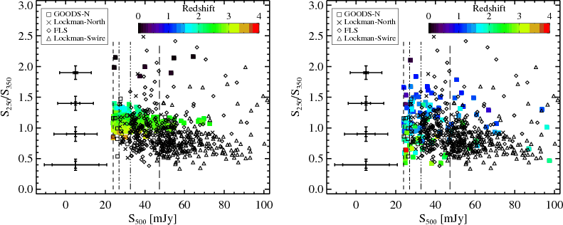 The high-redshift sources populate a specific area of the colour plane in both models, although the redshift distributions are different. In the Pearson et al. (2007) model the highest redshift objects, z>3 occupy the parameter space corresponding to S250/S350 colours <1.0 with S500 < 40 mJy, while the Xu et al. (2001) model locates the z>3 region rather at S250/S350 < 0.8 and the same flux cutoff, but with fewer objects and mixed with many low redshift SEDs. Similar cuts can be made for z>2 sources. Lower redshift sources may also be excluded by virtue of their higher S250/S350 colours.