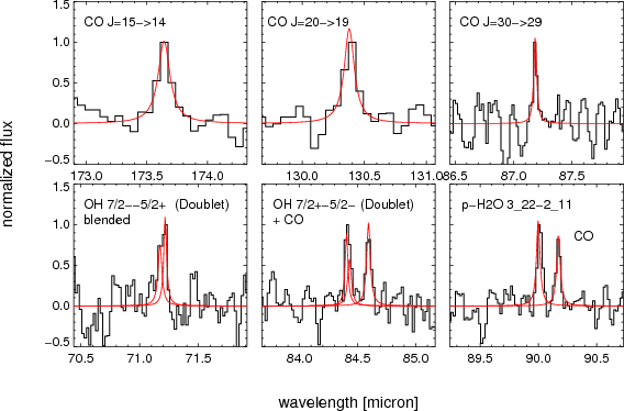 cm-2 (for discussion, see Brittain et al. 2009). The submillimeter data give a typical CO column density of 1018 cm-2 (Panic et al. 2010). From Fig. 5, assuming that the emission originates from the area between 13 and 100 AU, we derive column densities of 1016 to 1017 cm-2 in both models. These values indicate that PACS probes the part of the disk between the near-IR and submillimeter data.