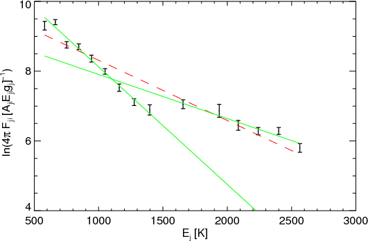 Figure 5: Rotational diagram of the CO lines in HD 100546 (crosses), overplotted with our models, using Eq. (2) from Justtanont et al. (2000). A single temperature fit (dashed) gives reasonable results, but a two-temperature approach (solid) yields a better description of the data. CO J=23-22 and J=31-30 are blended with H2O and OH respectively and were not used in the fit, nor are they shown here. |