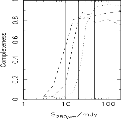 There are a number of possible systematic errors that could affect our results. One of the nice properties of the cross-ID method is that simulations suggest it is relatively immune to the effect of flux boosting due to source confusion and Eddington bias (Roseboom et al. in prep.). A second possible problem is that we do not have redshifts for all the sources in LH and LH-North. If the incomplete redshift information affects each redshift bin equally, the luminosity functions will all be slightly too low. However, if the incompleteness preferentially affects the high-redshift bins, we will have under-estimated the size of the evolution. Another potential problem is the large number of photometric redshifts in our analysis. We have used a Monte-Carlo simulation to generate artificial samples based on a no-evolution assumption, giving each source a photometric redshift with an accuracy equal to our least accurate redshifts, and then used the artificial samples to estimate the luminosity function in the six redshift slices. This analysis confirms that the large number of photometric redshifts does not generate spurious strong evolution. Finally, even if the dust in galaxies does not get systematically hotter with redshift, there will be a selection effect in our results, since at high redshift we are sampling a lower rest-frame wavelength, and the galaxies found in samples selected at shorter wavelengths tend to contain hotter dust. The effect of this selection effect is that we may have overestimated slightly the luminosity functions at z > 1.
