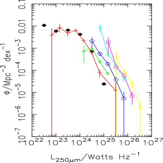 Figure 4 shows our estimates of the luminosity function in the six redshift intervals and the HerMES estimate of the local luminosity function (Vaccari et al. 2010), which was estimated over two fields covering 14.7 deg2 (including our LH area) and agrees reassuringly with our estimate in the lowest redshift slice. The luminosity function shows steady evolution out to z = 1, in the sense that the space-density of the most luminous sources gradually increases with redshift. This agrees well with the evolution in the luminosity function determined from the BLAST results (Eales et al. 2009). There is evidence in Fig. 4 for at most weak evolution at z > 1.