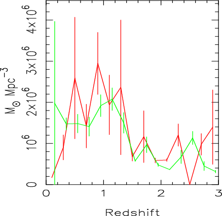 Figure 5: An estimate of the total metals formed per cubic Mpc in different redshift intervals using the method described in the text. We have made the estimates from the redshift distributions of GOODS-North (red) and LH-North (green) on the assumption that these redshift distributions represent the FIRB as a whole. |
