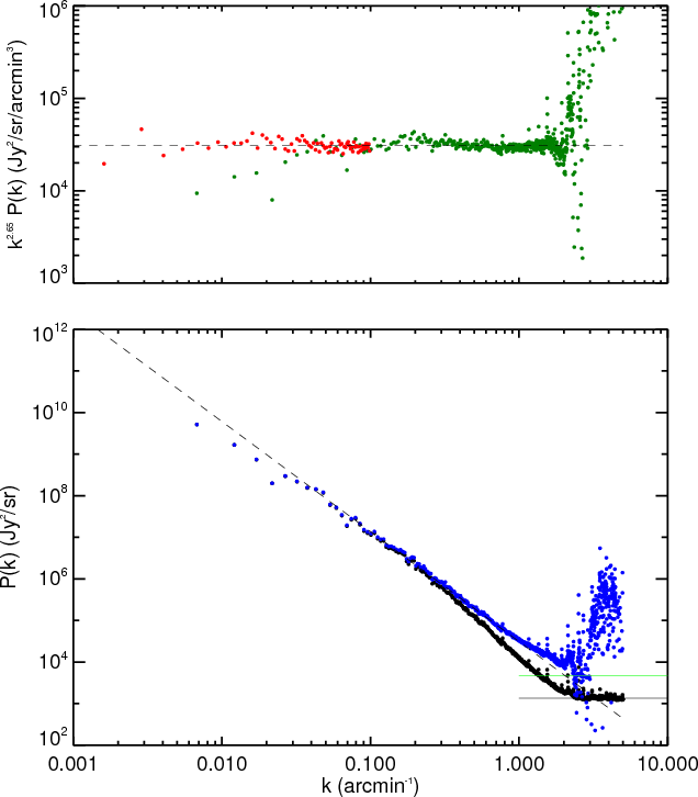 at wavenumbers from k=0.025 to 2.0 arcmin-1. In the top panel of Fig. 3 the green dots represent the power spectrum (multiplied by k2.65) of the SPIRE 250