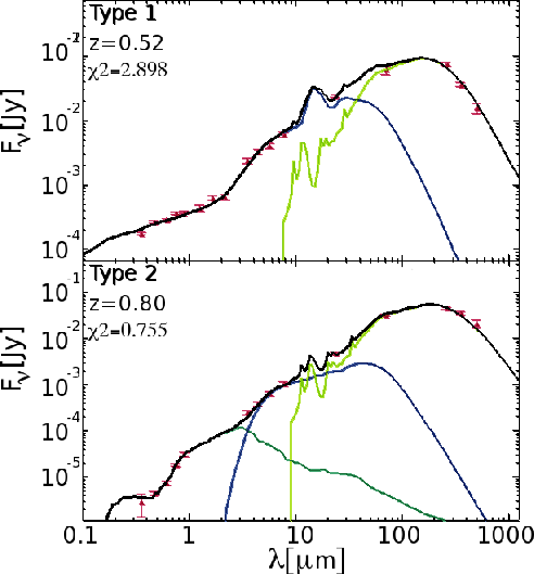 the far-infrared (FIR) spectral energy distributions (SEDs) of type 1 and type 2 AGN, allowing for the