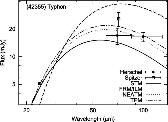 Figure 2: The observed Herschel and Spitzer flux values for Typhon. The line-styles are the same as in Fig. 1. |