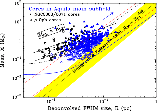 Mass versus size diagram comparing the locations of the 452 starless cores identified with Herschel in the Aquila main subfield to both models of critical isothermal Bonnor-Ebert spheres at T = 7 K and T = 20 K (black solid lines) and observed prestellar cores from the ground-based (sub)-mm continuum studies of |