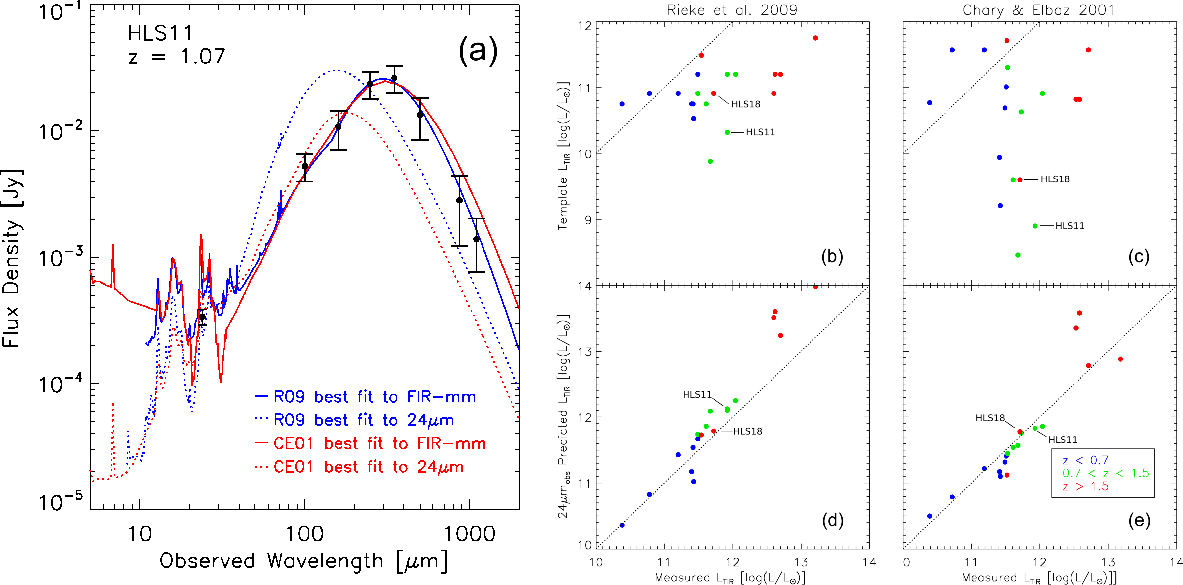 m emission is in good agreement with that measured from the FIR data for galaxies at z < 1.5 (Elbaz et al. 2010). The bottom right panels of Fig. 2 confirm this trend. The IR luminosity derived from 24