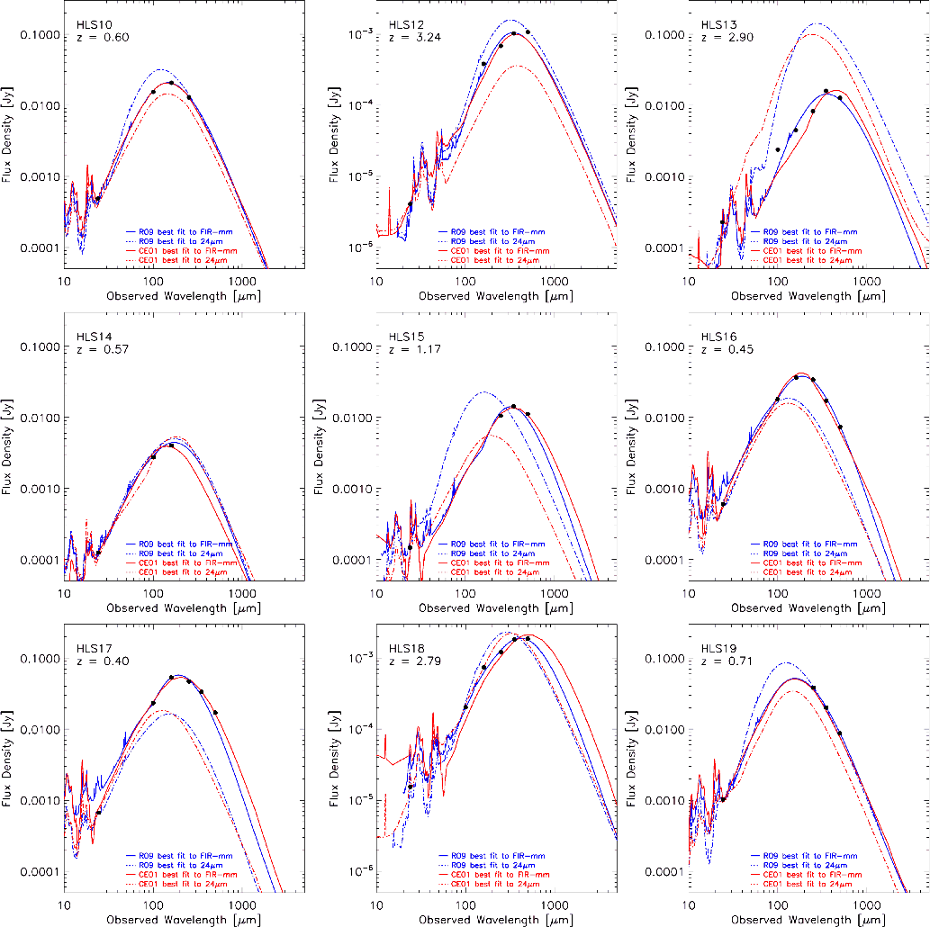solid lines show the best-fit R09 template (in blue) and CE01 template