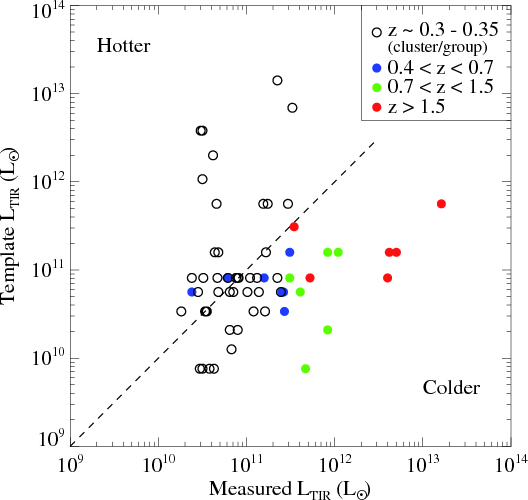 Equally interesting is the discovery of cluster/group-member galaxies that show large deviations in the opposite direction (Rawle et al. 2010). In other words, the SEDs of these galaxies resemble those of higher-lumninosity galaxies in the local Universe. These galaxies therefore are likely to have a larger amount of hotter dust and a more pronounced infrared SED peak compared to the local counterparts with similar infrared luminosities. Similar galaxies were also found in other clusters (Smith et al. 2010; Pereira et al. 2010), which possibly suggests that this type of SEDs may be specific to the cluster environment.