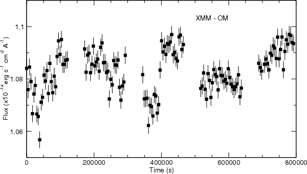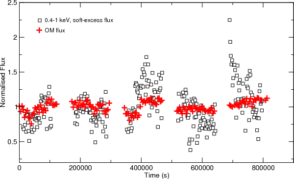 Open squares and crosses in Fig. 9 indicate the soft-excess and OM light curves plotted over the entire period of the XMM-Newton observations. We have multiplied the difference of each point in the OM light curve from its mean by 10, so that the excess variance of the OM light curve increases by a factor of 100. In order to compare the resulting OM light curve with the soft-excess light curve, we divided both of them with their mean.