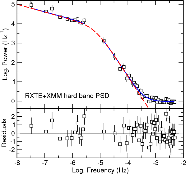 uncertainties. The broad frequency band, 2-10 keV PSD follows a power-law like shape of an index