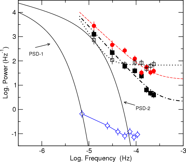 Hz (which corresponds to a time scale of 1.7 days). At higher frequencies, the PSD steepens to a slope of