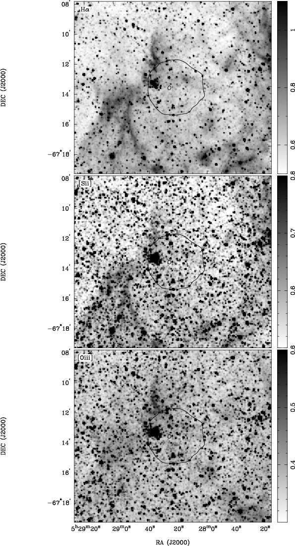 [S II] or [O III] bands and SNR J0528-6714 (Fig. 5), confirming the earlier observation of Mathewson et al. (1985). The high-density group of stars KMHK 943 (Kontizas et al. 1990) is visible on the eastern rim of the SNR J0528-6714. Martayan et al. (2006)