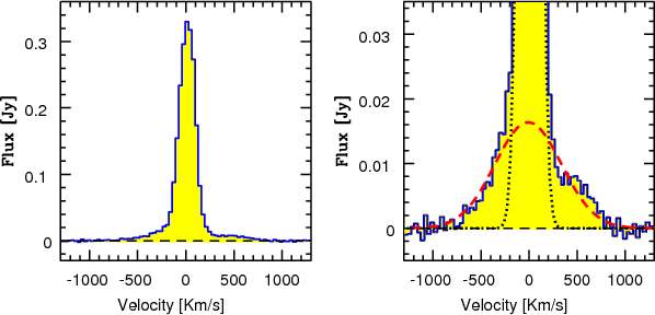 Figure 1: Continuum-subtracted spectrum of the CO(1-0) transition in Mrk 231. The spectrum was extracted from a region twice the beam size (full width at half maximum, FWHM), and the level of the underlying continuum emission was estimated from the region with v > 800 km s-1 and v < -800 km s-1. Left panel: full flux scale. Right panel: expanded flux scale to highlight the broad wings. The line profile has been fitted with a Gaussian narrow core (black dotted line) and a Gaussian broad component (long-dashed line). The FWHM of the core component is 180 km s-1 while the FWHM of the broad component is 870 km s-1, and reaches a Full Width Zero Intensity (FWZI) of 1500 km s-1. |