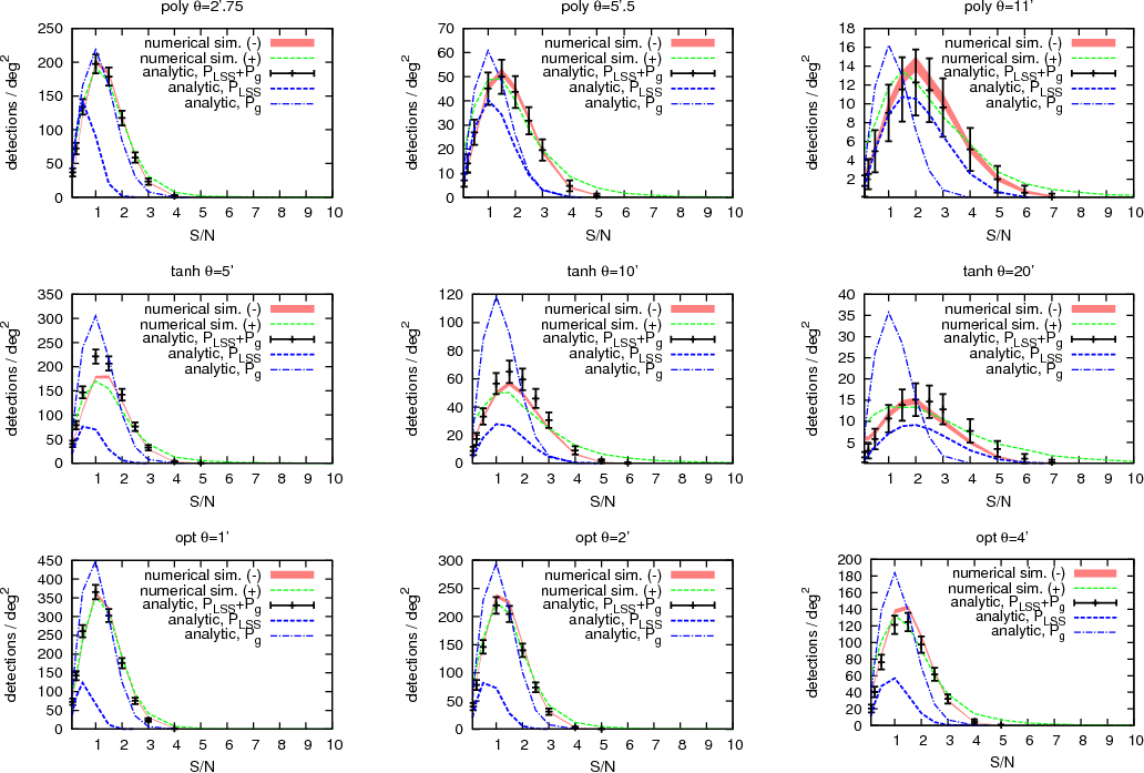 We finally compare the contribution of the LSS and the noise to the total signal by treating them separately. Their number counts are plotted with dashed and dot-dashed lines in Fig. 5. All filters show an unsurprisingly large number of detections caused by the noise up to signal-to-noise ratios of 3 and a number of detections caused by the LSS increasing with the filter scale except for the optimal filter, which always suppresses their contribution to a negligible level. Thus, the LSS contaminates halo catalogues selected by weak lensing up to signal-to-noise ratios of 4-5 if its contribution is ignored in the filter definition. Note that the total number of detections can be obtained only by counting the peaks from the total signal, i.e. LSS plus noise, and not by adding the peaks found in the two components separately, because the blending of peaks is different for the two cases.