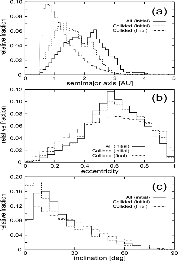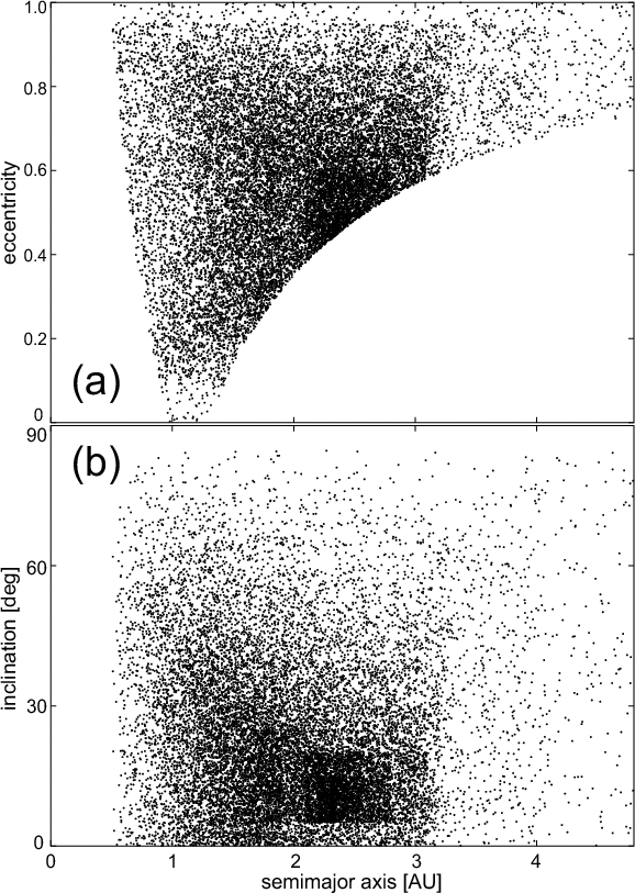 Figure 1: Initial osculating orbital elements of the NEA-like particles in our numerical model. a) Semimajor axis vs. eccentricity. b) Semimajor axis vs. orbital inclination. (Inclinations are referred to the ecliptic at J2000.0.) |